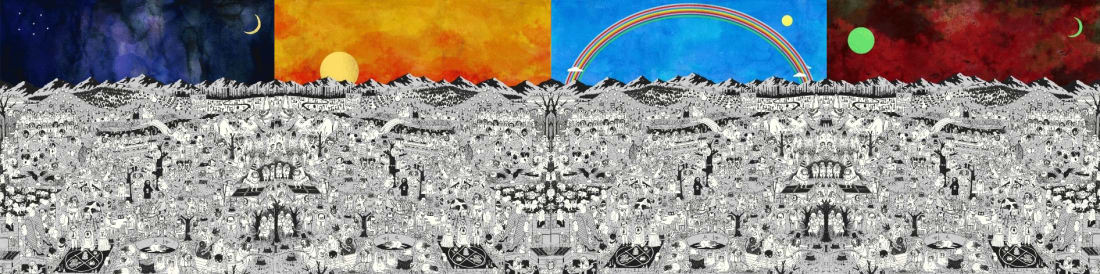 He had this idea of four different-colored skies, and just asked for a drawing to go [with] that. I sketched lots of small scenes—sort of satirical in tone but not literally referring to the lyrics—and then arranged them on a landscape. I suppose the unifying theme is the absurdity of human life on earth. Mostly, I was just trying to make something that’s good for people to look at while listening to the record. I just drew the type of album cover I would want if I made an album, which I never will.